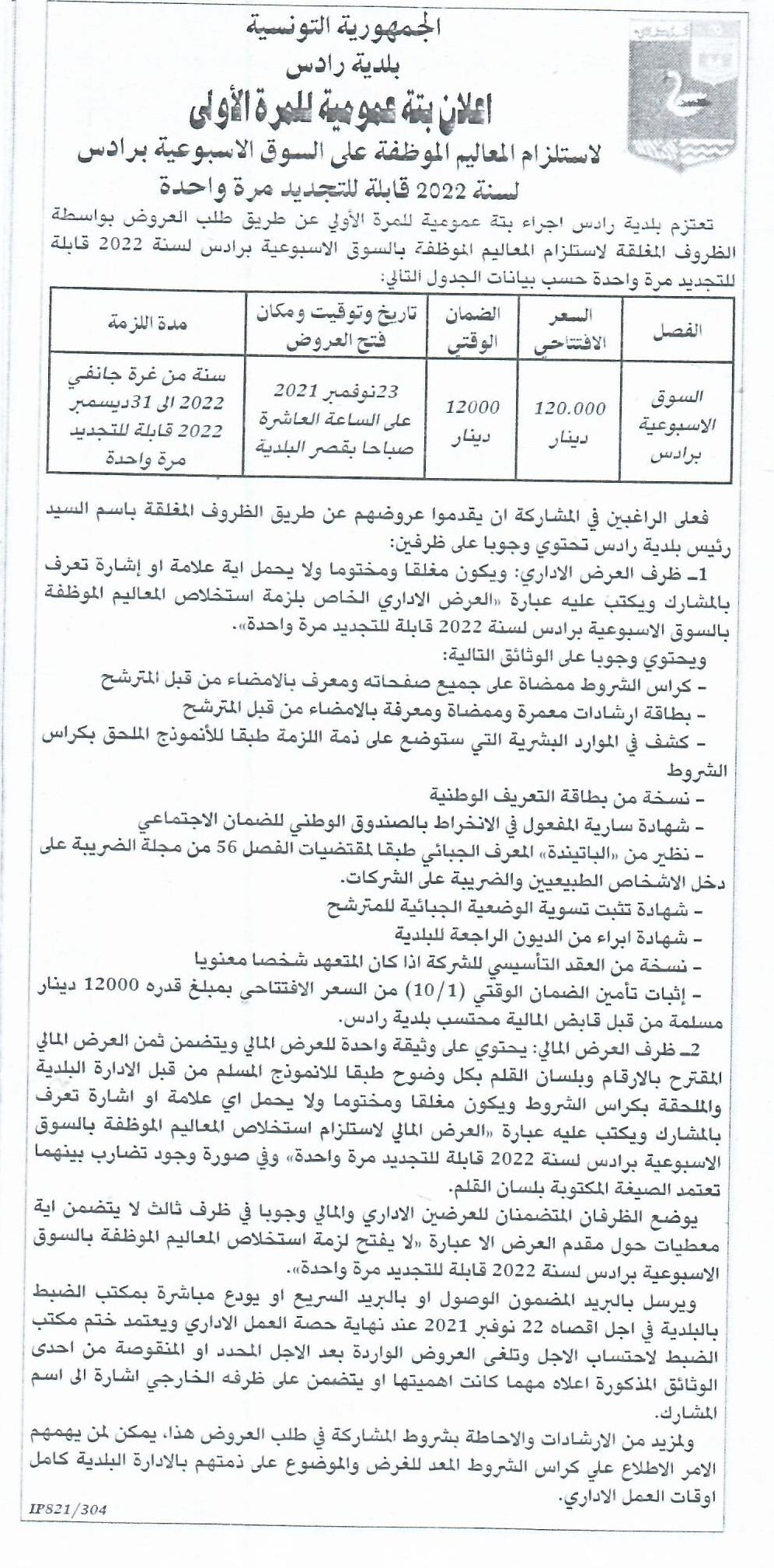 لاستلزام المعاليم الموظفة على السوق الأسبوعية برادس لسنة 2022 قابلة للتجديد مرة واحدة